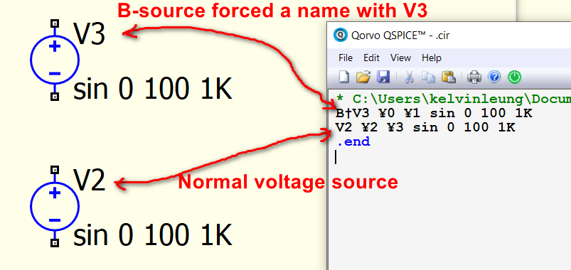 If your netlist device is called B†V1, this is a Behavorial source instead of Voltage source, and you forced to rename it from Bnnn to Vnnn.