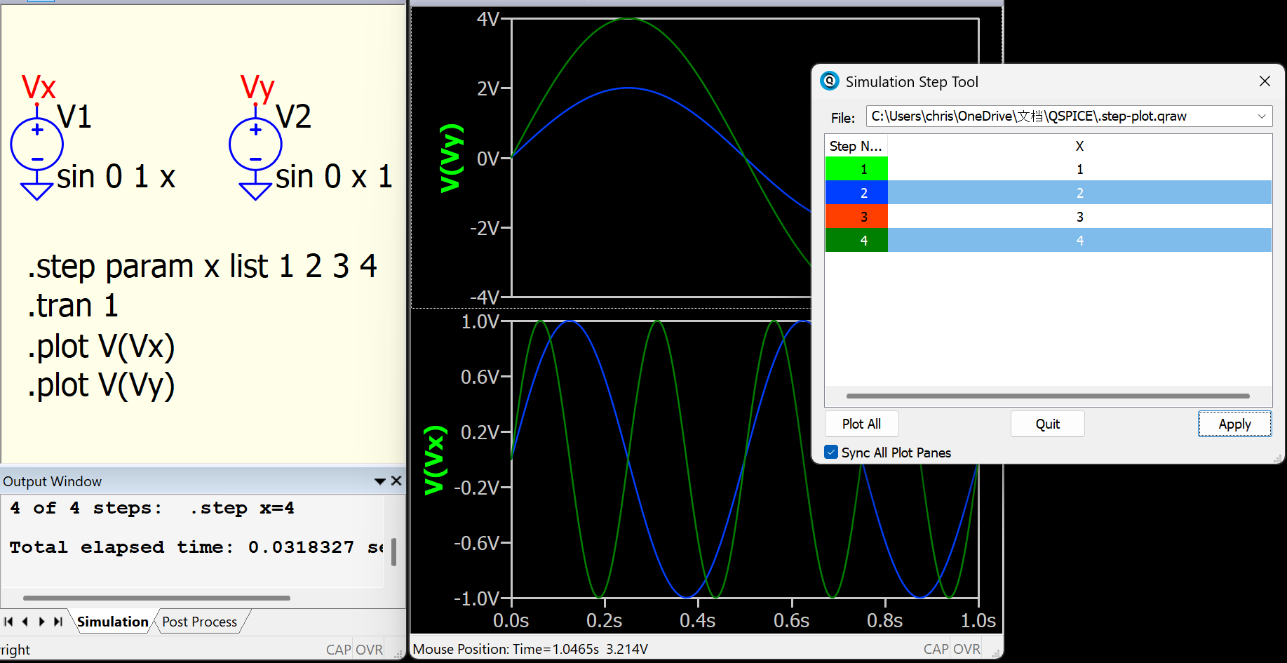 - Create any circuit that uses a ‘.step param’ directive to run multiple simulations (e.g., ‘.step param MYPARAM 1 4 1’).