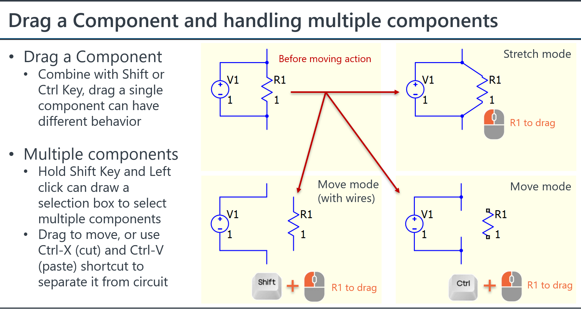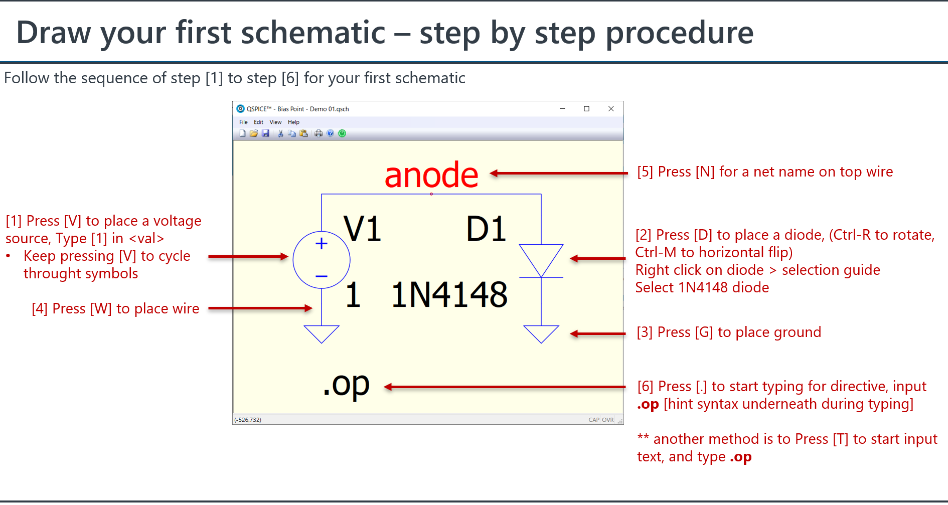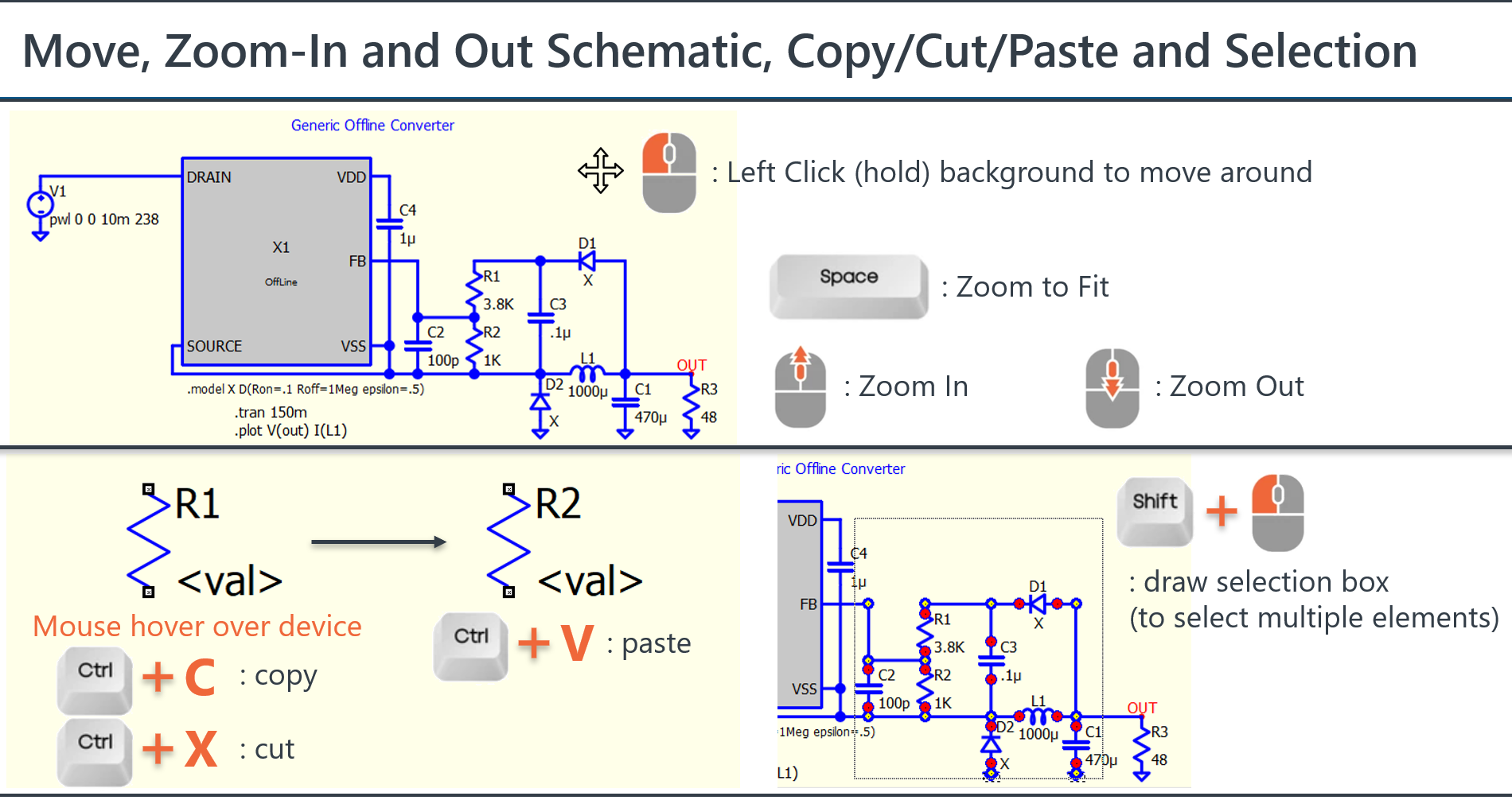 Finally, Qspice encourages users to utilize shortcuts. This prevents the mouse cursor from constantly moving between the menu and the schematic when creating a circuit. Once you become familiar with shortcuts and attribute, you will find that you can draw a circuit very effectively and quickly simulate and change parameters.