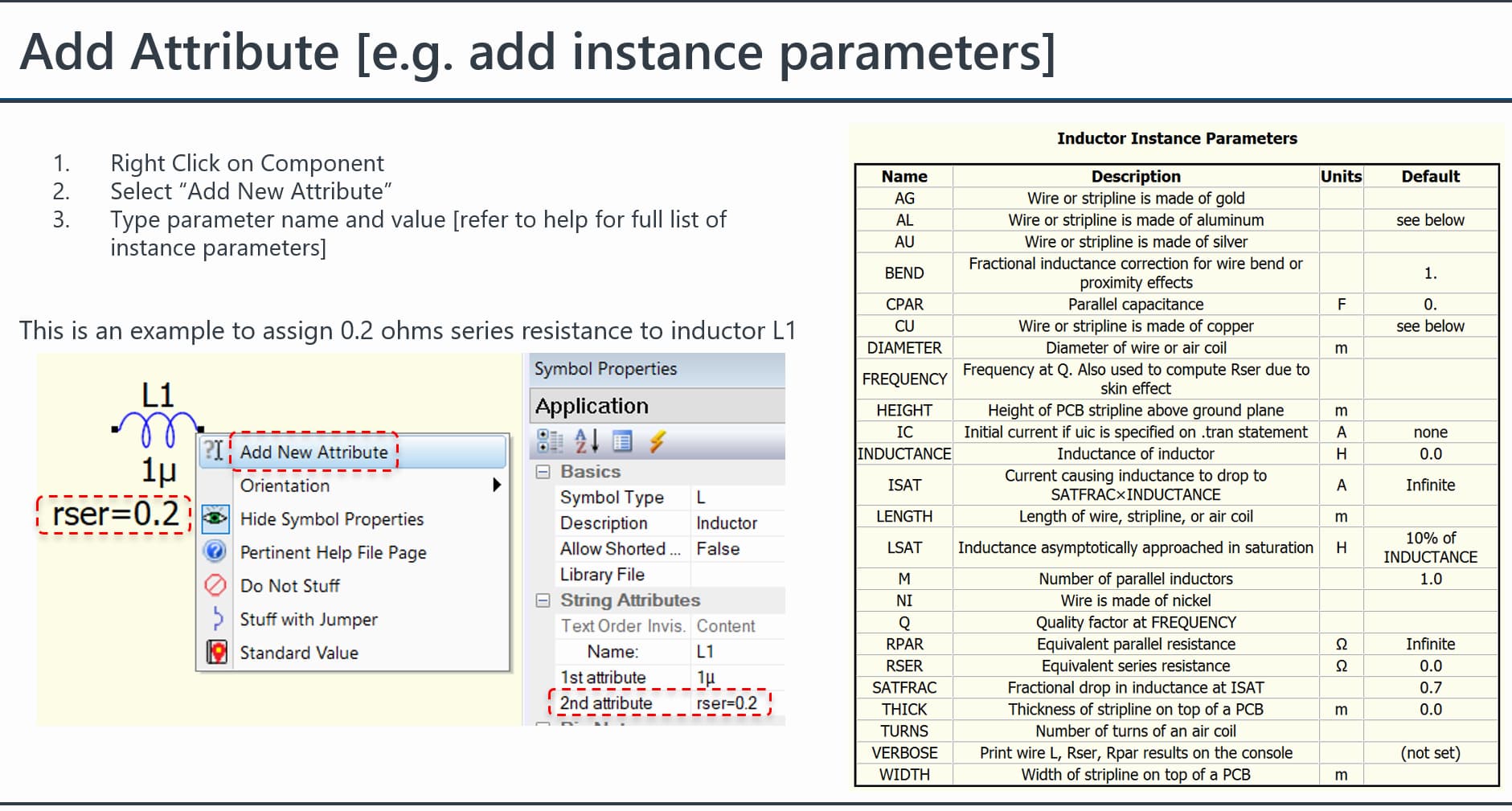 Unlike LTspice, there is no right click window in setting instance parameters of a device, instead, you add or remove (or comment) “Attribute” to decide what instance parameters to include. Here is an example to add Rser instance parameter to an inductor.
