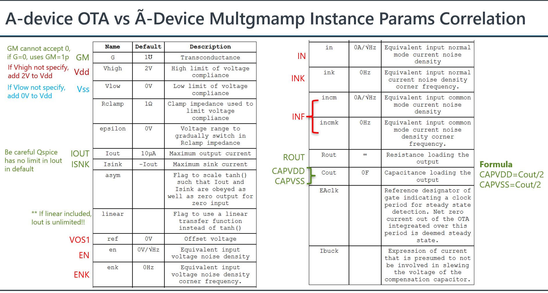 When comparing the A-device OTA and the Qspice Ã-device OTA, the noise parameters en, enk, in, and ink have identical definitions between them. However, the A-device OTA has incm and incmk, while the Ã-device OTA has inf, and I have no idea how to deal with this discrepancy.