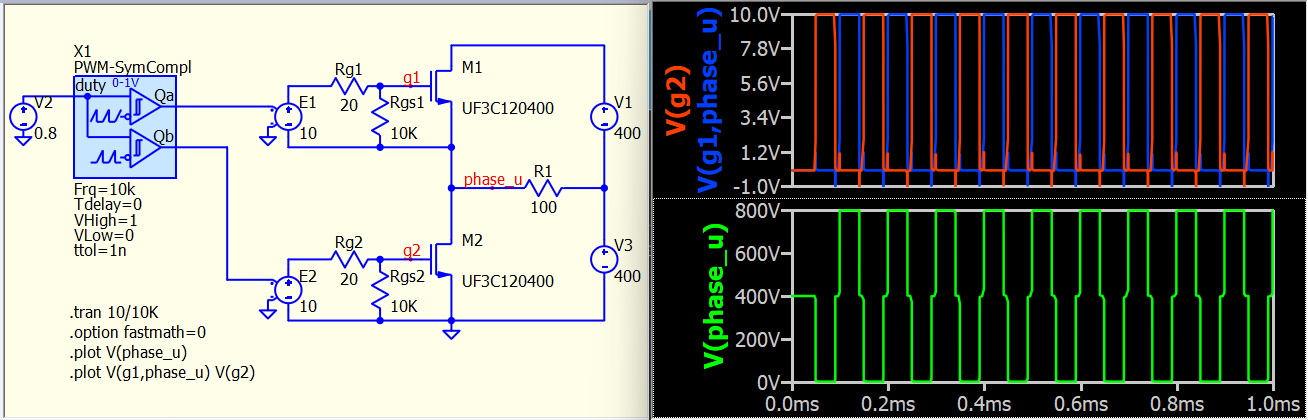 I am trying to simulate a three-phase inverter using SiC MOSFETs, as shown in the schematic. I can observe the gate pulses at the u_T and u_B nodes; however, the phase voltage (phase_u) is not appearing. What changes or modifications are required to resolve this issue?