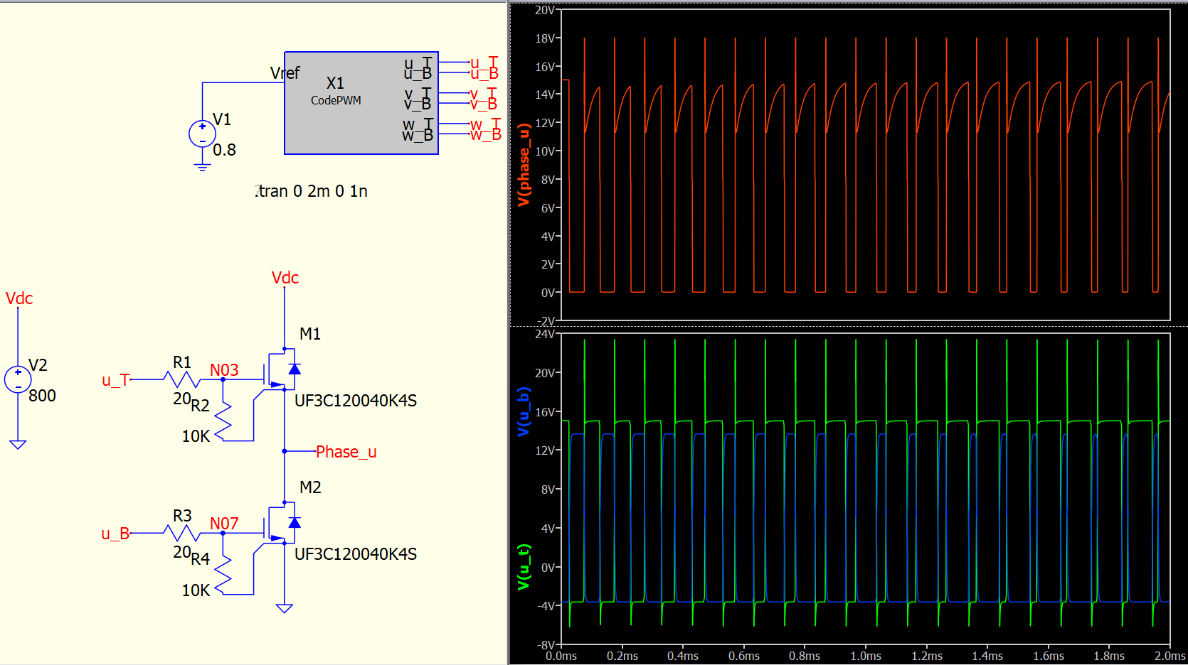 Ideally, the phase_U voltage should toggle between 0 V and 800 V, but this behavior is not observed.