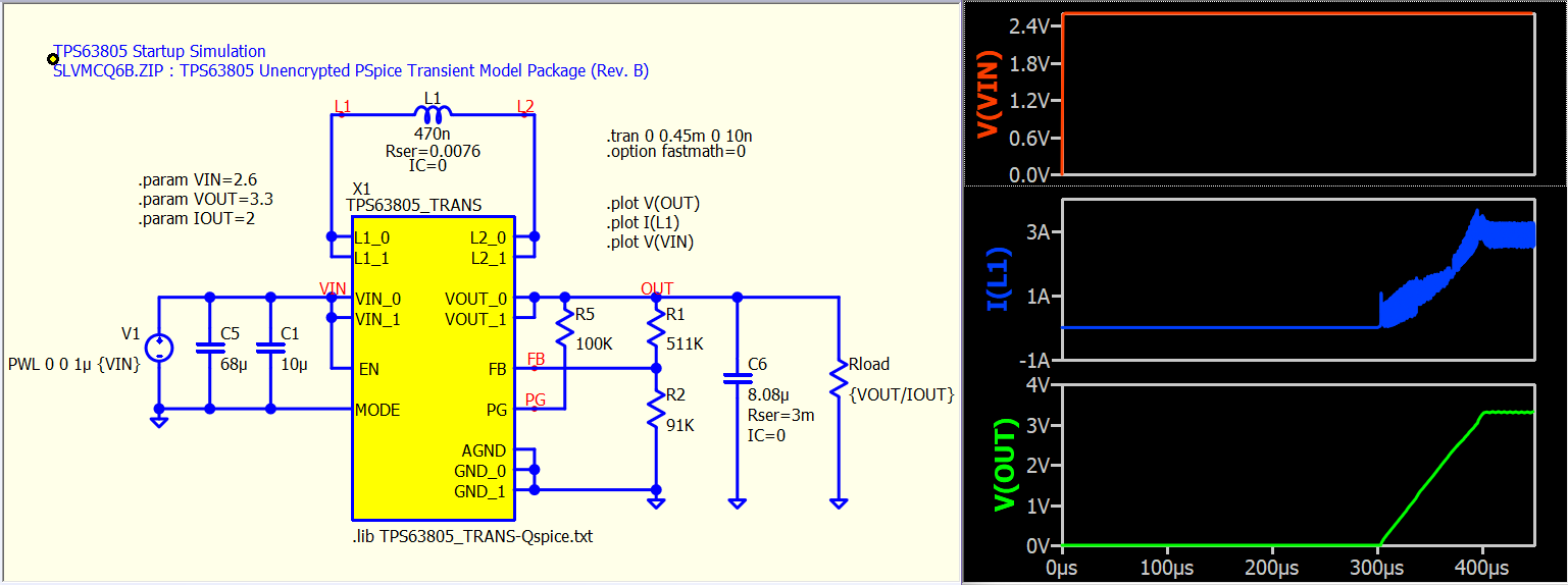 Here is netlist file and library if anyone try to run it from SPICE program. pspice_netlist_TPS63805.cir.txt (524 Bytes)