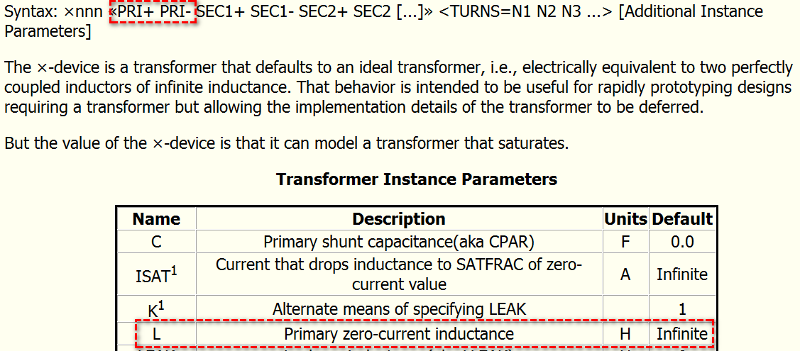 - Device guide: Provides a more detailed explanation in the inductor (L) and transformer (×-device) section.