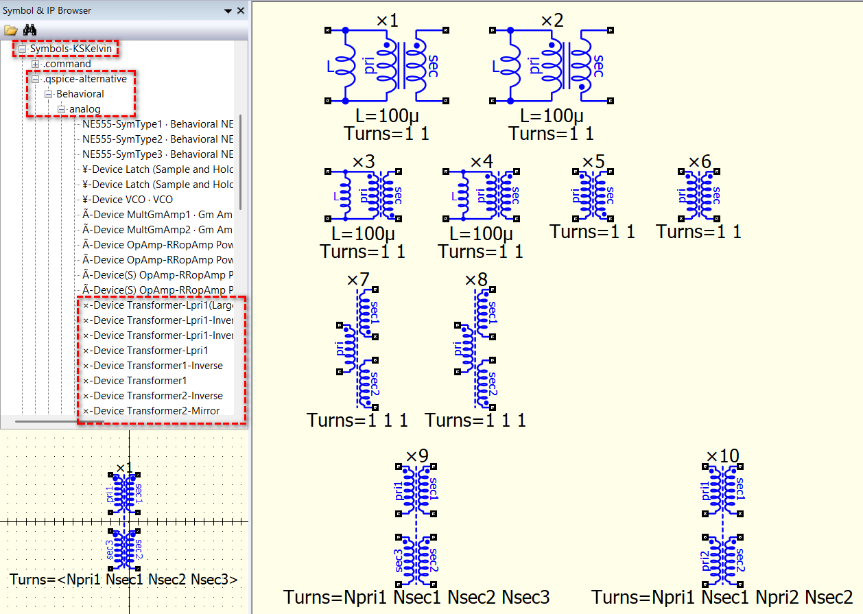 Well, primary or secondary is just a name. In 4 windings, they are all in coupling. Are you building a push-pull configuration (two primary and two secondary)? If you don’t like the standard Qspice version (i.e., ×9 in the above post, one primary three secondary, drawing best fit to flyback), I highly recommend downloading my custom symbols and using the ×10 version. For that one, I particularly rearranged the pins and labels to fit into a push-pull drawing (it will use Turns=3 1 3 1 instead). But again, these are just ways to manage the symbol. In Qspice, it runs in the netlist, and the syntax of the ×-Device is…