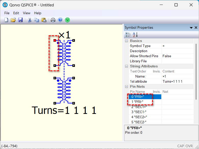 OR, download my custom symbols library (Qspice/Symbols-KSKelvin) as I added labels to describe the winding for the ×-device. You can customize the labeling or pin arrangement by creating your own version of the ×-device.
