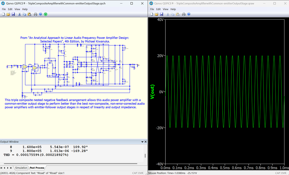 Here’s this week’s schematic capture, by our friend and frequent audio circuit simulation contributor Michael Kiwanuka. This is from his “An Analytical Approach to Linear Audio Frequency Power Amplifier Design: Selected Papers”, 4th Edition, by Michael Kiwanuka. “This triple composite nested negative feedback arrangement allows this audio power amplifier with a common-emitter output stage to perform better than the best non-composite, non-error-corrected audio power amplifiers with emitter-follower output stages in respect of linearity and output impedance.” Please send any submissions to me at tim.mccune@qorvo.com (Schematic Capture Post #066)