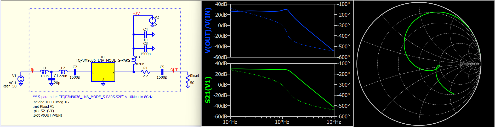 Why is nothing connected at V(OUT)? In general, you wouldn’t design something without a load, especially in RF circuit. If you are working in RF, possibly s-parameters analysis (.net) would be more helpful as you can get S11, S21, S12, and S22. Please note that the s-parameters model in Qspice only supports .ac analysis (frequency domain analysis) and not .tran (transient analysis). In this schematic setup, there is no difference in simulation results with and without the 5V power supply. The s-parameters (.s2p) of TQP3M9036 is from 10Meg, therefore, don’t simulate from 100Hz, as it is out frequency range of that s-parameter file.
