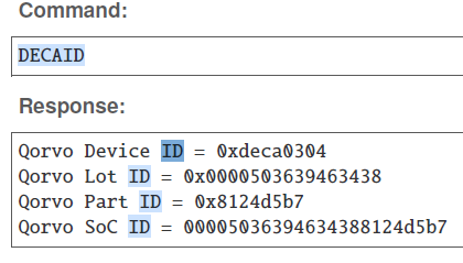 Looking at the Developer documentation I thought maybe the “DECAID” command would do it, but apparently none of the ID values shown match the board SN: