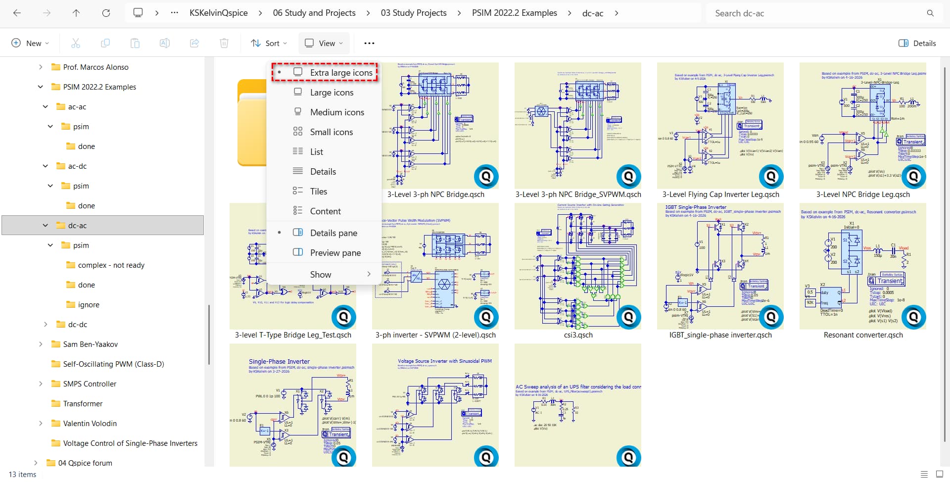 If you need to search for a QSpice schematic, an easy way is to set the View to Extra large icons in File Explorer. Thumbnails are available for .qsch files and can aid your search. I was aware of this technique for .qsym symbols, but I just realized it also applies to schematics. Even after three years of working with QSpice daily, I still missed this trick!